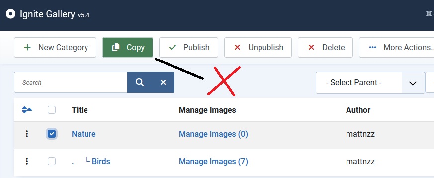 Please note, if you use the gallery "copy" button, new image files will be created for the new gallery. When you copy a gallery, a new gallery is made, and the amount of images on the server increases.