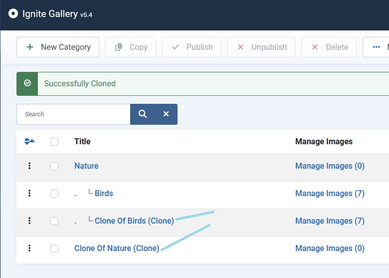 - Cloned images inherit published state from original gallery. If yes, then you can not change the pubished state in the cloned gallery. The cloned image will get the published state from the original image