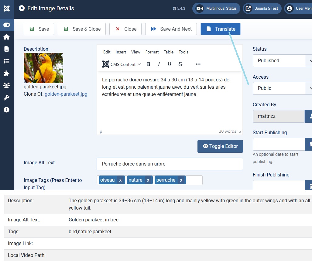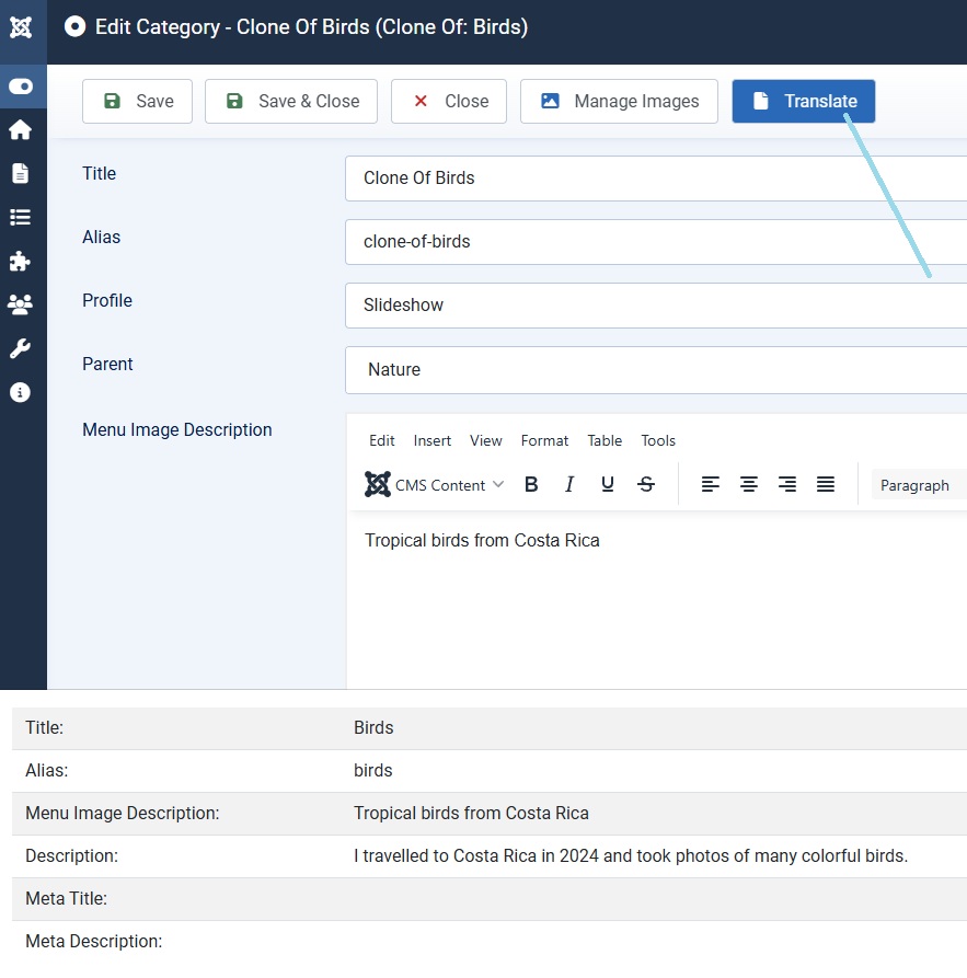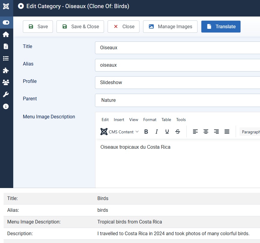 5)Edit the gallery and press the translate button, the text from the original gallery will show at the bottom :