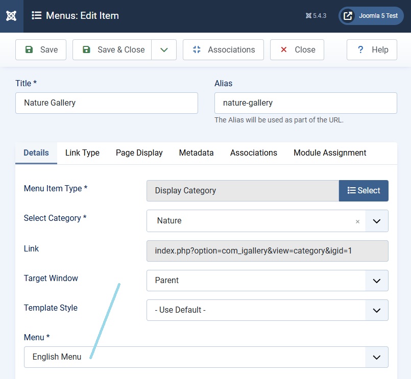 11)Create an English menu item to the English gallery (choose the ignite gallery component):