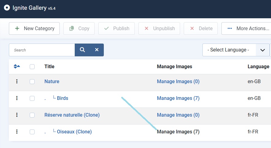 Ignite gallery manages multilingual content by "Cloning" galleries. When you Clone a gallery, a copy of the gallery is made with new database records. But the image files in the original gallery are used in the cloned gallery. This way no extra image files are created (no extra server space is used). In the cloned gallery, you can add new language content.